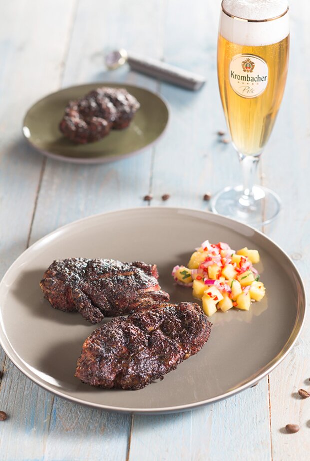 Schweinenackensteak in der Kaffeekruste mit Ananassalsa