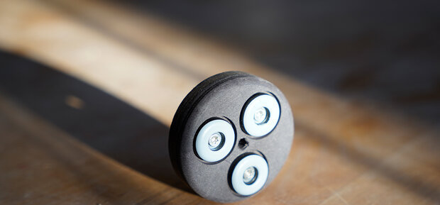 - Puck: Ø 6,5 cm, 1,6 cm dick (3x 22 mm Schraubgleiter, leicht versenkt)