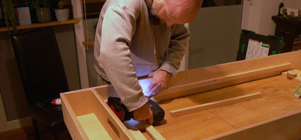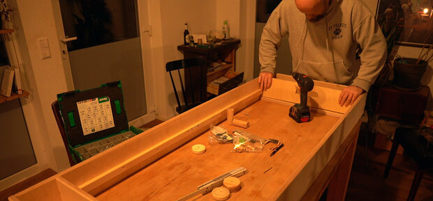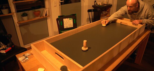 Alle Holzteile fein schleifen (außer die Spielfläche), Tisch testen und prüfen, ob der Puck frei läuft – dann ist der Airhockey-Tisch bereit für das erste Match!