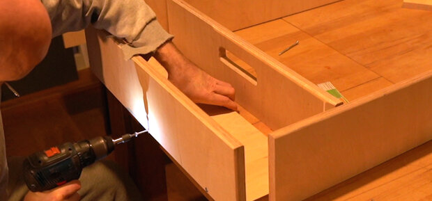 Beide langen Seitenteile mit dem Bodenbrett verschrauben, bündig ausrichten und anschließend mit der äußeren Stirnwand verbinden.