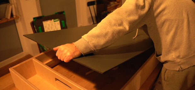 Die HPL-Spielplatte passgenau auf die Innenleisten einlegen. Sie wird nicht verschraubt, sodass sie jederzeit entnommen werden kann.