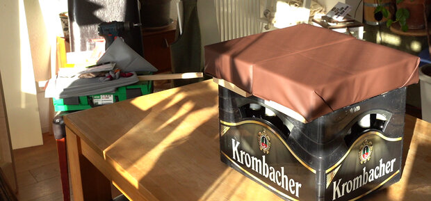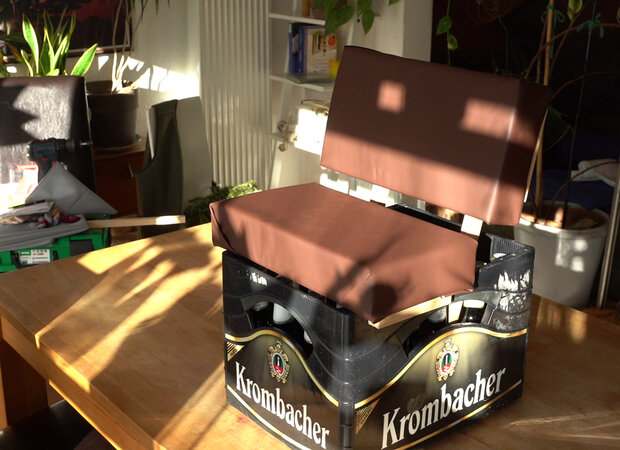 Sitzplatte auf den Bierkasten legen und bei Bedarf die zweite gepolsterte Platte mit den langen Kanthölzern hochkant als Rückenlehne einsetzen – und fertig ist der Bierkastenhocker!