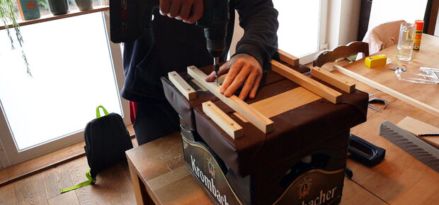Kurze Kanthölzer von unten an eine Sitzplatte schrauben, sodass sie außen am Bierkasten greifen. Die langen Kanthölzer an der zweiten Platte befestigen – sie dient später als Rückenlehne.