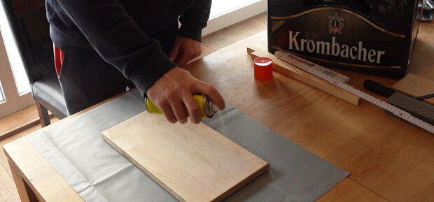 Schaumstoff mit Sprühkleber auf die Holzplatten kleben und fest andrücken. Unterlage verwenden, um den Arbeitsbereich zu schützen.