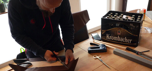 Stoff oder Kunstleder über die gepolsterten Platten ziehen und von unten tackern. Zuerst mittig fixieren, dann die Seiten sauber spannen und die Ecken ordentlich einschlagen.