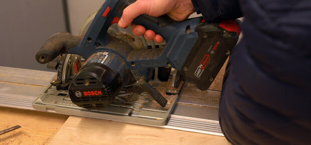 Multiplexplatte mittig zusägen, sodass zwei gleich große Sitzplatten entstehen. Alle Kanten sauber schleifen oder fräsen, damit der Stoff später nicht einreißt.