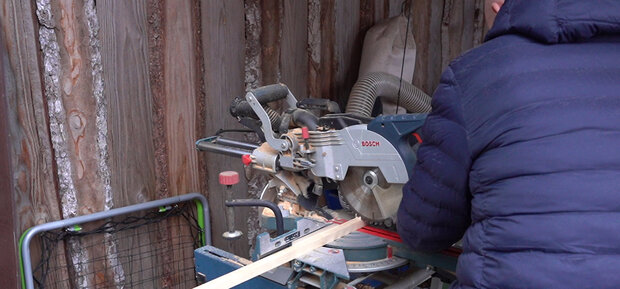 Kanthölzer zuschneiden: vier kurze Stücke für den Sitz und zwei längere für die Rückenlehne. Schnittkanten kurz schleifen.