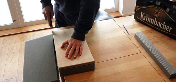 Schaumstoff in zwei passende Stücke zuschneiden. Mit einem scharfen Messer sauber und ohne Druck arbeiten.