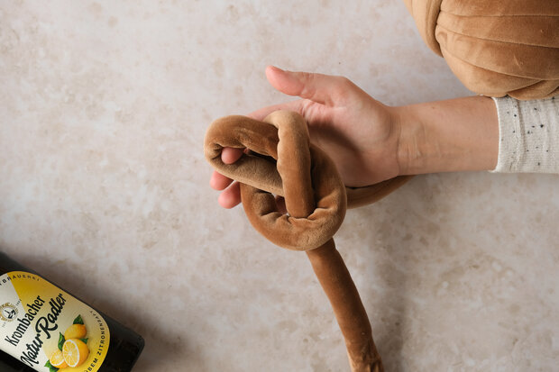 Eine Schlaufe legen, Fadenende durchziehen und die erste Masche festziehen. Dann insgesamt 9 Maschen bilden, indem du die Wolle nacheinander durch die vorherige Masche führst. Alle Maschen auf ca. 5 cm Höhe bringen - so bestimmst du die Breite deines Chunky Shoppers.