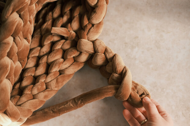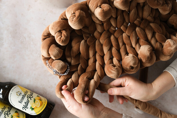 Die Tasche flach auslegen und die Position der Henkel festlegen. Wolle in der vorletzten Reihe innen gut verknoten, unter der entsprechenden Masche eine Schlaufe nach außen ziehen und den Henkel wie beim Maschenanschlag in die gewünschte Länge stricken. Die letzte Masche an der gewünschten Stelle befestigen, Garnende verknoten und den zweiten Henkel spiegelgleich arbeiten. Fertig ist dein Krombacher Chunky Shopper.
