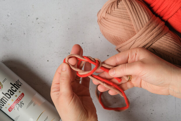 Lege aus beiden Schnüren eine Schlaufe und ziehe die langen Enden hindurch, um die erste Masche zu sichern. Anschließend häkelst du so viele Luftmaschen, bis die Kette der Breite deines Laptops entspricht - sie bildet die Basis deiner Tasche.