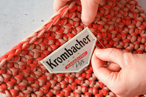 Trenne das Logo vorsichtig aus der Dose, klebe es auf Karton oder Filz und sichere die Kanten mit Tape. Schlage kleine Löcher hinein und nähe das Logo auf die Tasche – fertig ist deine selbst gehäkelte Laptoptasche!