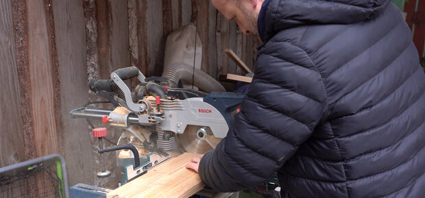 Holzbrett zusägen, sodass 5 Teile entstehen: zwei Standfüße, zwei Wurfflächen und ein Zählbrett. Alles exakt und winklig zuschneiden – saubere Kanten zahlen sich später beim Klappen und Zusammenbauen aus.