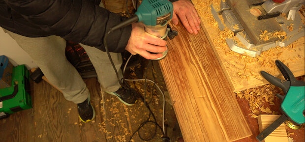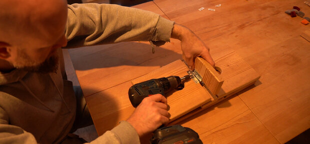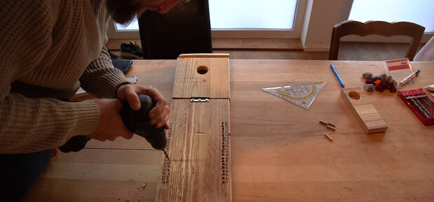Die Position der Löcher mittig in der Breite anzeichnen und ca. 7 cm von der oberen Kante platzieren. Mit einem 40-mm-Forstnerbohrer sauber ausbohren – unbedingt Restholz unterlegen, um Ausrisse zu vermeiden.