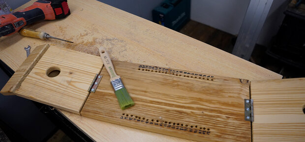 Wurfflächen mit dem Zählbrett und die Standfüße mit den Wurfflächen über Scharniere verbinden. Je Verbindung zwei Scharniere verwenden.