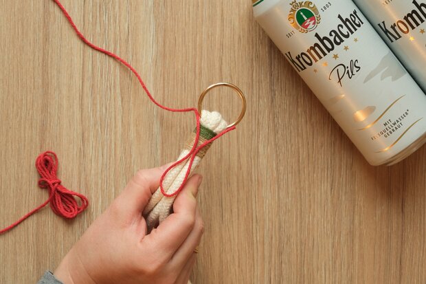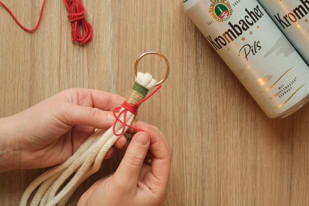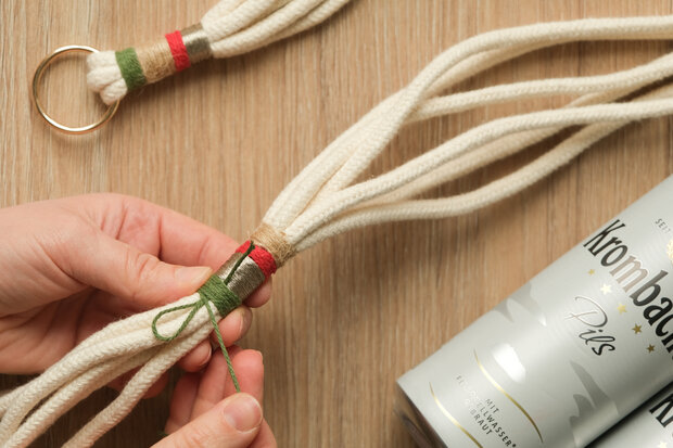 Mit einer dünnen, farbigen Schnur eine ca. 8 cm lange Schlaufe legen und direkt unter dem Ring platzieren. Die Schnur anschließend straff und gleichmäßig um alle Seile wickeln.