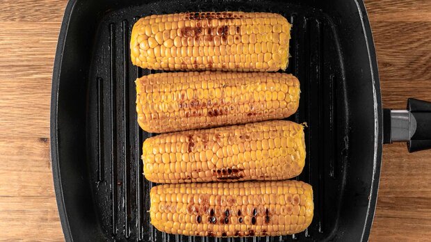 Butter aus dem Kühlschrank nehmen und weich werden lassen. In der Zwischenzeit die Grillpfanne erhitzen, mit Öl einpinseln und Maiskolben braten, bis die Grillstreifen sichtbar sind. Dabei gelegentlich wenden.
