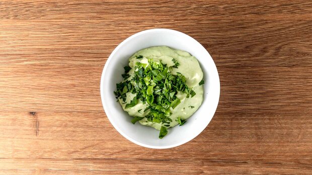 Koriander waschen, trocken schütteln sowie grob hacken. Dann den Koriander mit der Avocadocreme in eine Schüssel geben. Das Ganze mit Salz und Pfeffer würzen.