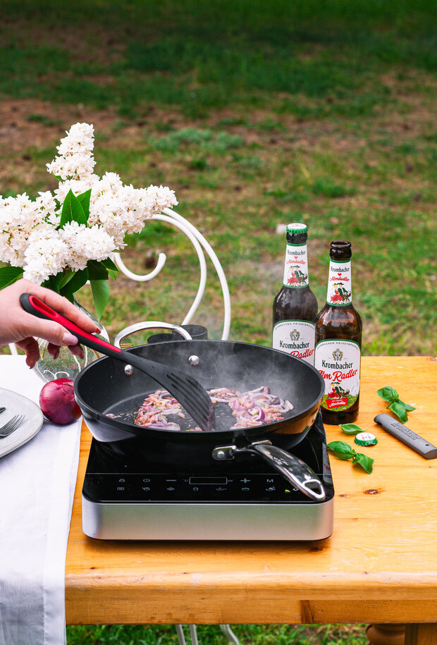 In einer großen Pfanne den Speck auslassen, bis er knusprig ist. Dann die gewürfelten Zwiebeln hinzufügen und glasig braten.