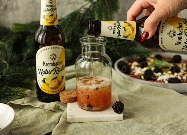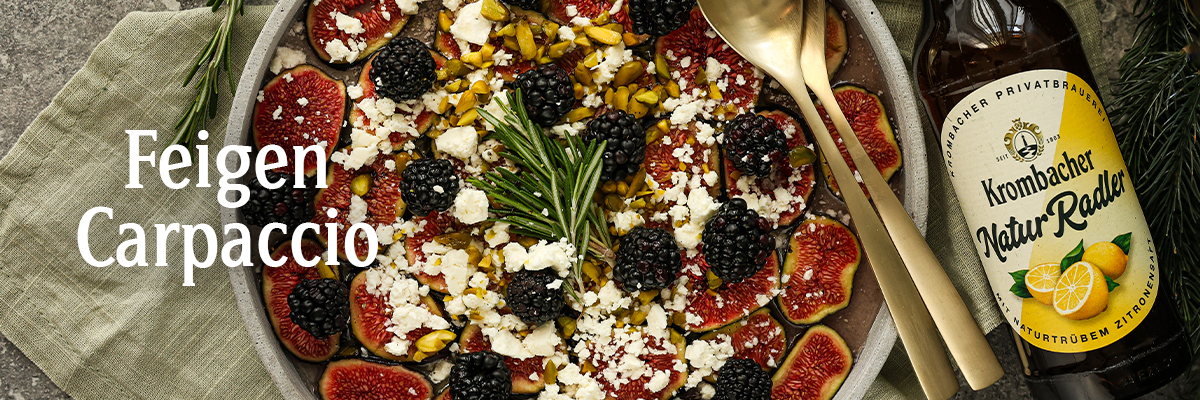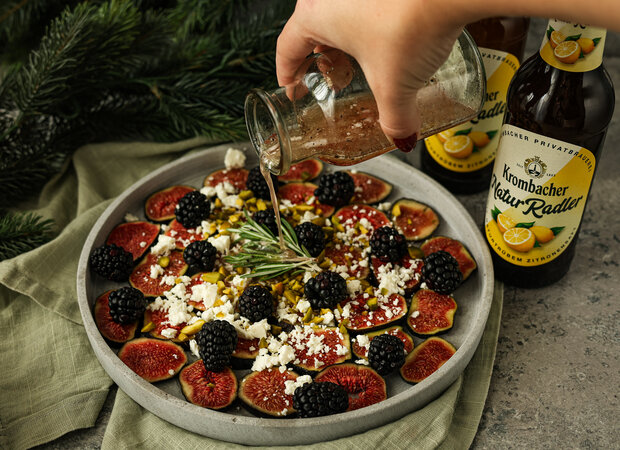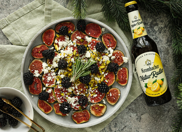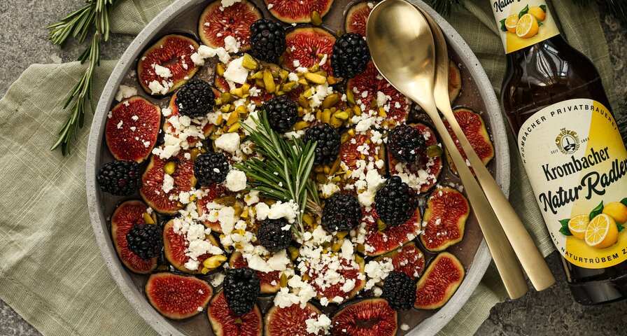 Ein leichter Snack voller Geschmack: Saftige Feigen treffen auf frische Brombeeren, würzigen Feta und knackige Pistazien. Abgerundet wird das Ganze mit einem feinen Dressing und einem kleinen Schluck Krombacher Natur Radler - perfekt für jeden Moment, in dem ihr euch etwas Besonderes gönnen wollt.
