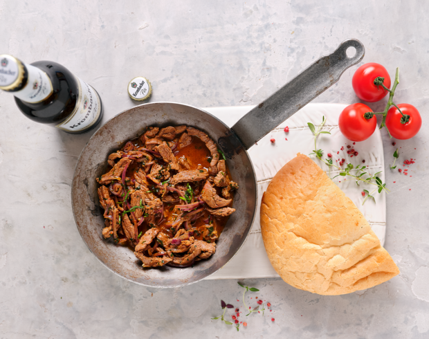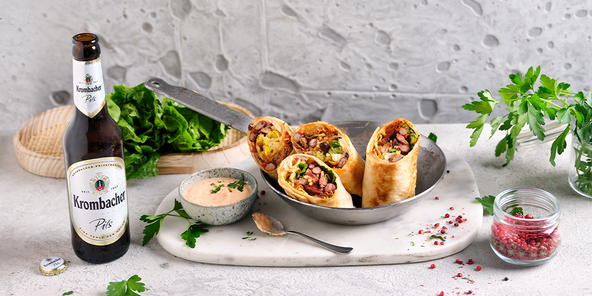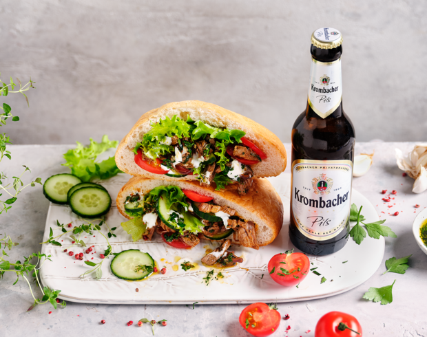 Bei unserem Gyros im Fladenbrot treffen mehrere Geschmäcker aufeinander. Typisch griechischer Gyros fusioniert mit einer leckeren argentinischen Sauce: Chimichurri. Abgerundet wird der Geschmack am Ende mit unserem Krombacher Pils!