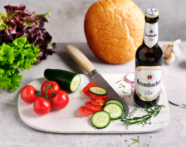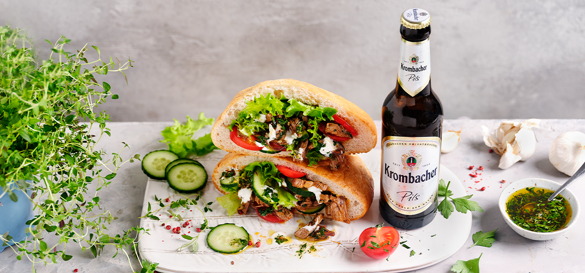 Fladenbrote aufschneiden und mit Gyros, Salat, Tomate und Gurke füllen. Mit griechischem Joghurt und restlichem Chimichurri beträufelt genießen. Dazu ein eisgekühltes Krombacher Pils servieren!