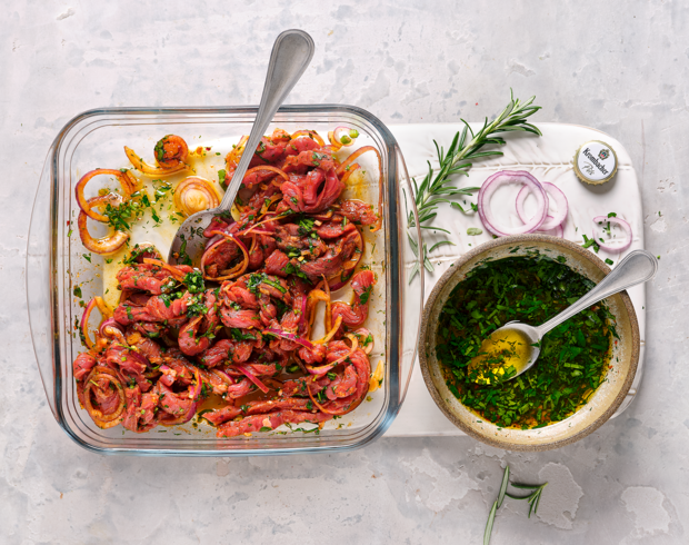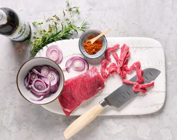 Als nächstes kümmern wir uns um die Marinade. Hierfür Zwiebel schälen und in dünne Ringe schneiden. Thymian und Rosmarin fein hacken. Rindersteak in Streifen schneiden.