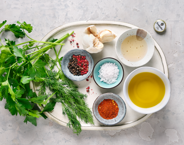 Olivenöl und Condimento Bianco in eine Schüssel geben. Petersilie, Dill, Knoblauch und Pul Biber miteinander vermengen. Danach mit rosa Pfefferbeeren, Salz und Pfeffer abschmecken und zur Seite stellen.