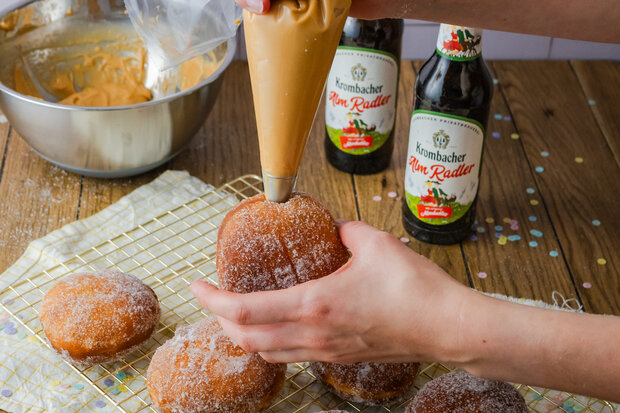 Mit einem kleinen Messer die Krapfen einstechen und anschließend mit der Alpenradler-Milchkaramell-Füllung befüllen.