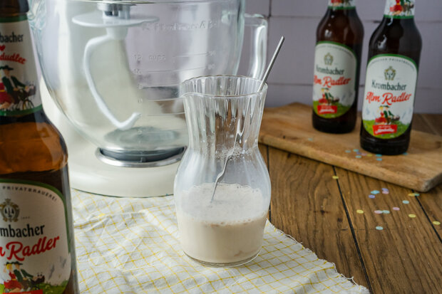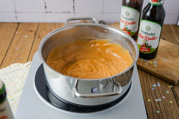 Den inzwischen fest gewordenen Karamellpudding 1 Minute auf höchster Stufe cremig schlagen. Zuerst den Alpenradler-Sirup einrühren und anschließend so viel frisches Krombacher Alpenradler hinzufügen, bis die Konsistenz schön cremig ist.