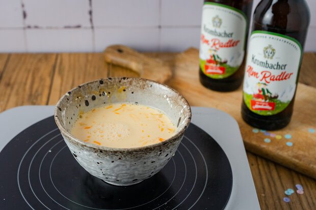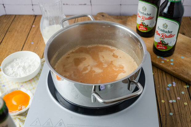 Als Nächstes einen dicken Alpenradler-Sirup kochen. Dafür 150 ml Krombacher Alpenradler in einen Topf geben und bei mittlerer Hitze so lange erhitzen, bis ein dicker Sirup entsteht. Es ist normal, dass die Masse am Ende sehr stark reduziert ist, da das Wasser verdampft.