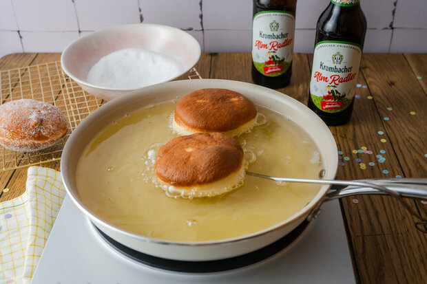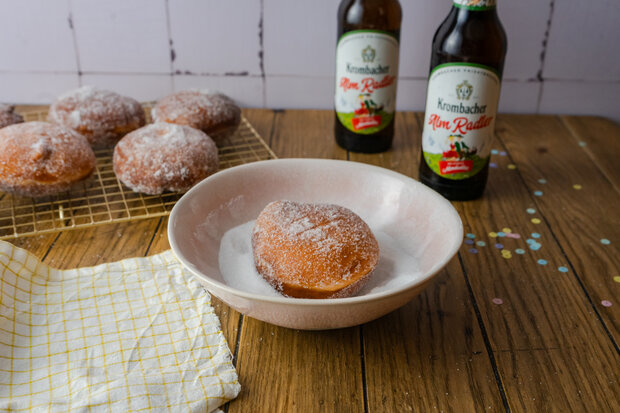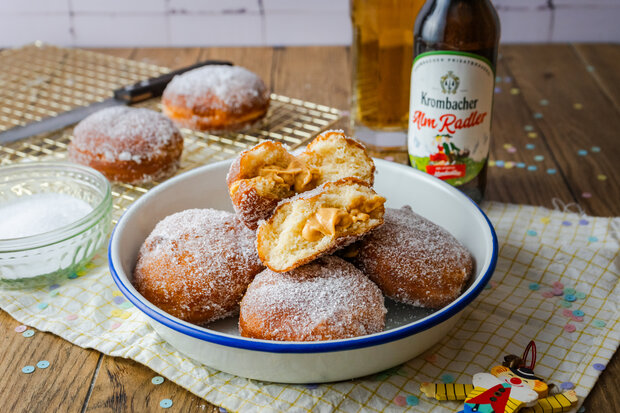 Diese Krapfen mit Krombacher AlmRadler-Milchkaramellfüllung sind der perfekte Genuss für die Karnevalszeit! Der luftige Teig und die cremige Füllung aus AlmRadler und Karamell machen sie besonders saftig und aromatisch. Abgerundet mit Puderzucker werden sie zum Highlight jeder Faschingsfeier. Feiern, genießen und sich auf die närrische Zeit einstimmen – so wird der Karneval noch köstlicher!