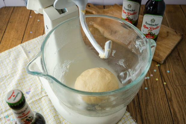 Den Hefeteig 5–10 Minuten kneten, bis er samtig, weich und homogen ist. Er sollte nicht mehr kleben.