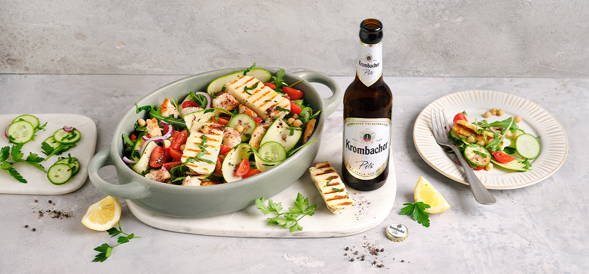 Libanesischer Brotsalat mit Halloumi - Perfekt für alle Fans der orientalischen Küche oder derer, die vielleicht mal etwas Neues ausprobieren möchten. Ein leichtes und leckeres Gericht auch für wärmere Tage. In Kombination mit einem kühlen Krombacher Pils einfach ein purer Genuss!
