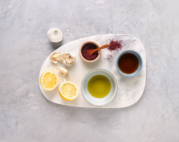 Für das Dressing Knoblauch schälen und fein hacken. Anschließend mit Sumach, 4 EL Olivenöl, Zitronensaft, Ahornsirup und Condimento Bianco vermischen.