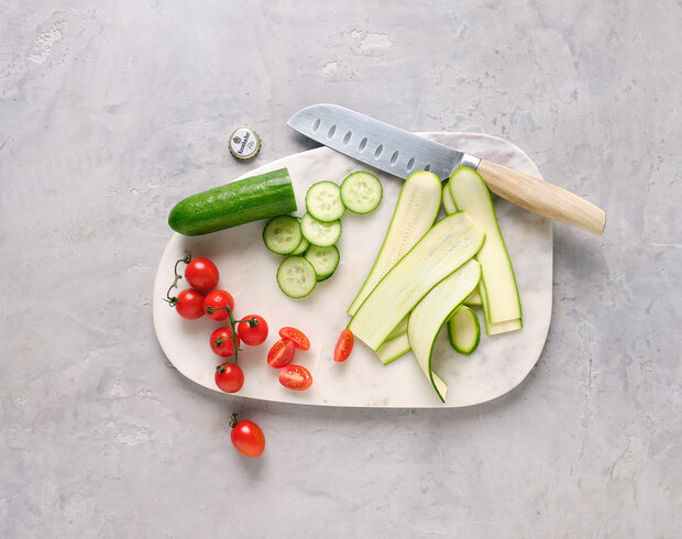 Zucchini waschen, trocknen und in dünne Streifen hobeln. Die Gurke in dünne Scheiben schneiden. Tomaten ebenfalls waschen, trocknen und vierteln.