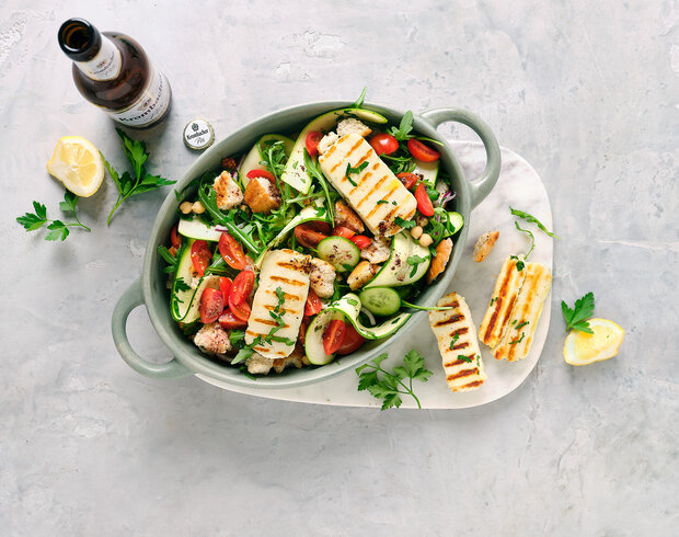 Zum Schluss Zucchini, Gurke, Tomaten, Zwiebel, Rucola Salat, Petersilie und Kichererbsen in eine große Schüssel geben. Das Dressing unterheben. Kurz vor dem Anrichten das geröstete Brot mit in den Salat geben. Nach Belieben mit Salz und Pfeffer abschmecken. Brotsalat mit dem gegrilltem Halloumi servieren. Dazu ein eisgekühltes Krombacher Pils genießen.
