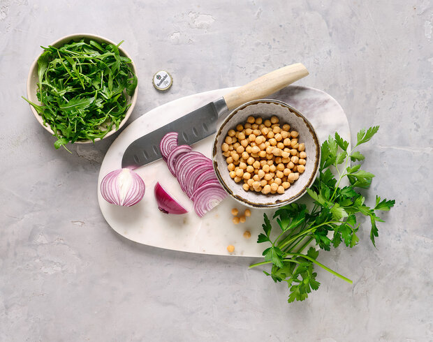 Zwiebel schälen, halbieren und in dünne Halbringe schneiden. Rucola-Salat waschen und trocknen. Petersilie grob hacken. Kichererbsen abtropfen lassen.