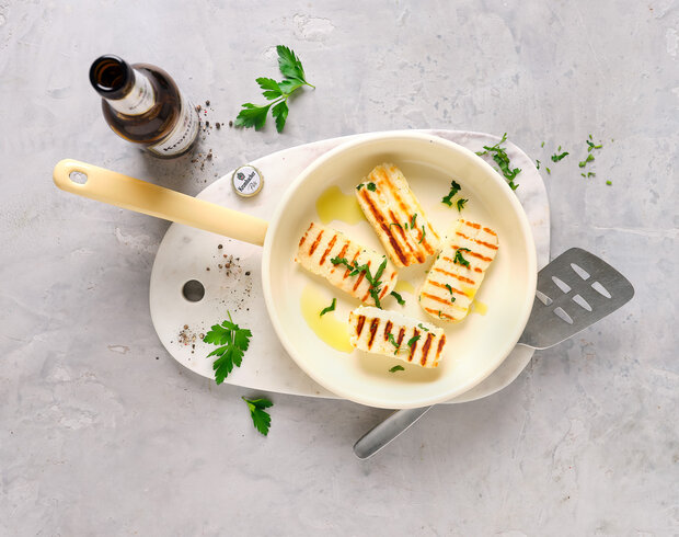 Halloumi in 4 Scheiben schneiden. 1 EL Olivenöl in einer Pfanne/Grillpfanne erhitzen. Käse darin von beiden Seiten goldbraun anbraten.