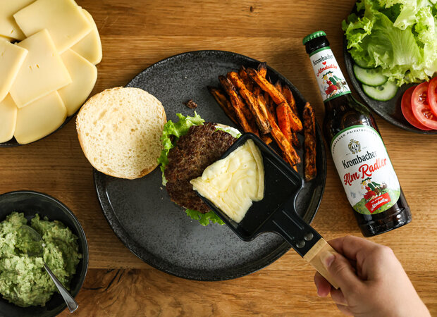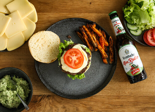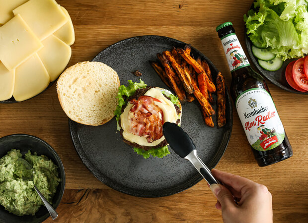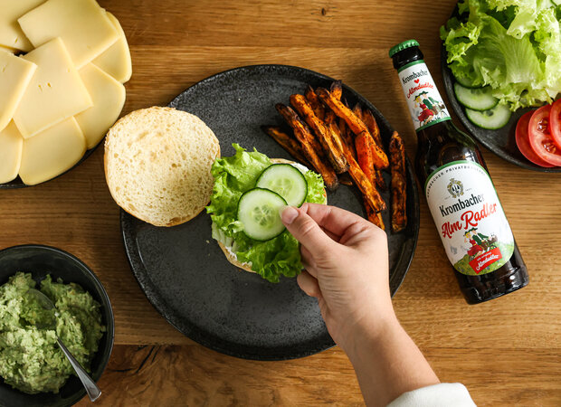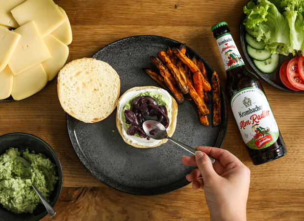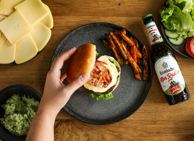 Zum Schluss den fertigen Burger mit einem kühlen AlmRadler genießen – der perfekte Abschluss für diesen herzhaften Genuss!