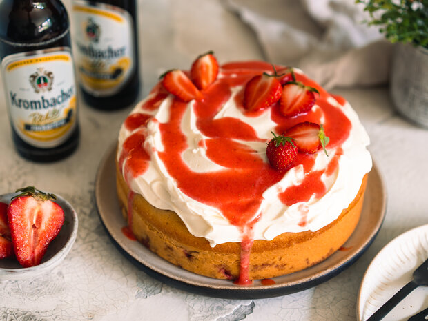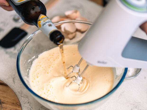 Eier mit Zucker für 10 Minuten richtig schaumig aufschlagen. Dann unter Schlagen das Öl und das Radler dazugeben. Nun den Backofen auf 170 °C Ober-/Unterhitze vorheizen. Mehl und Backpulver miteinander vermengen, auf das aufgeschlagene Ei sieben und mit einem Kochlöffel vorsichtig, aber gründlich unterrühren.