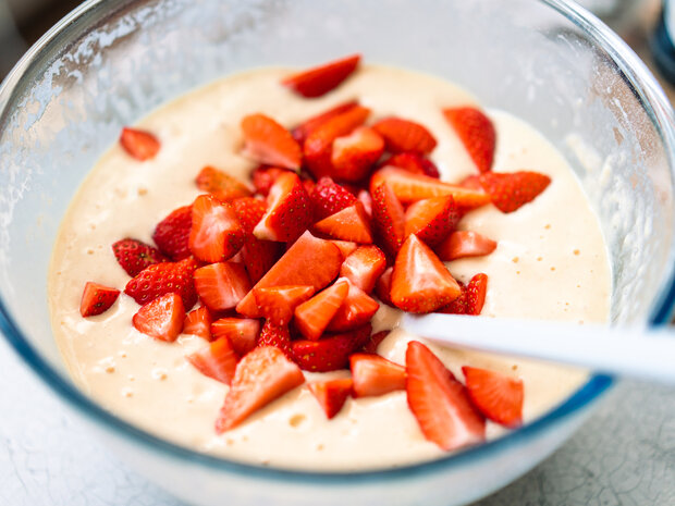 Nun, bis auf 1 Handvoll der Erdbeeren ebenfalls unterheben und den Teig in eine gefettete und bemehlte Springform geben.