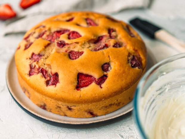 Die restlichen Erdbeeren darüber streuen und für ca. 60 Minuten backen. Mit einem Holzstäbchen testen, dass nichts mehr daran kleben bleibt.