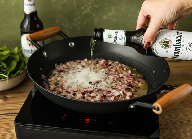 Mit einem Schluck Krombacher Pils ablöschen und kurz einkochen lassen - so bekommt die Sauce ihre feine, malzige Tiefe.