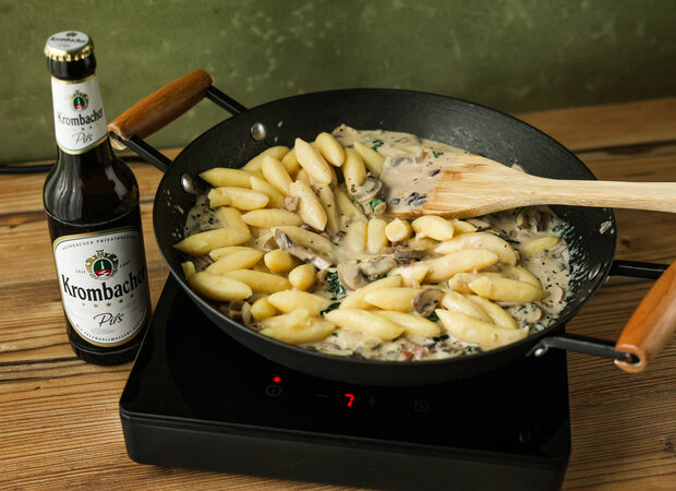 Herzhaft, cremig und wunderbar bodenständig: Schupfnudeln mit Biersauce sind echtes Wohlfühlessen, das Tradition und Genuss verbindet. In der samtigen Sauce entfaltet ein Schluck Krombacher Pils seine feine Malznote und verleiht dem Gericht Tiefe und Charakter, ohne sich in den Vordergrund zu drängen. Ein unkompliziertes Pfannengericht, das zeigt, wie gut sich klassische Küche und Biergenuss ergänzen - perfekt für entspannte Genussmomente.