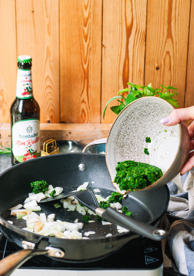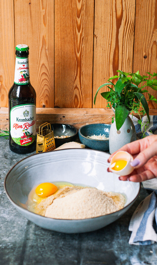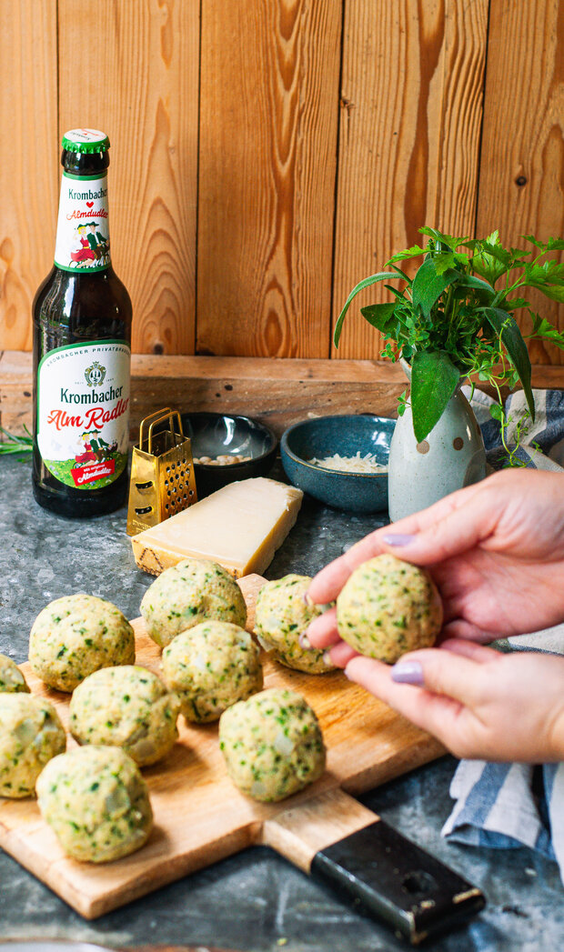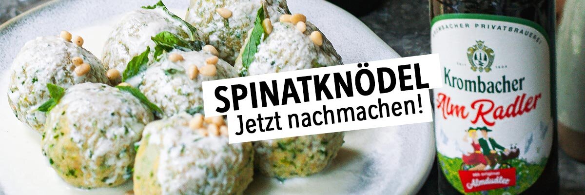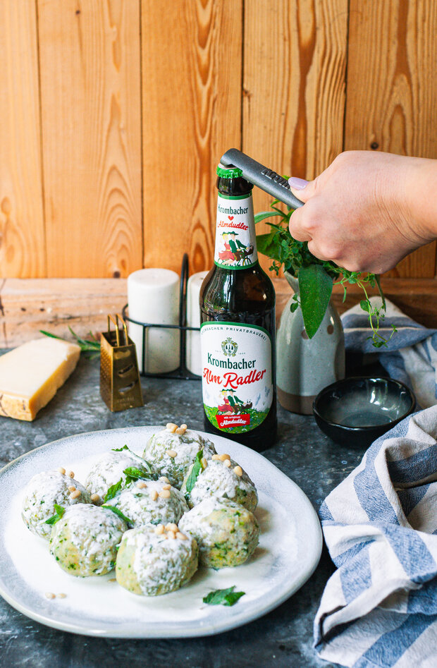 Zum Servieren die Knödel auf Tellern anrichten und mit der Parmesan-Schmelze übergießen. Mit den gerösteten Pinienkernen und frischem Babyspinat garnieren und mit einem kühlen Krombacher AlmRadler genießen.