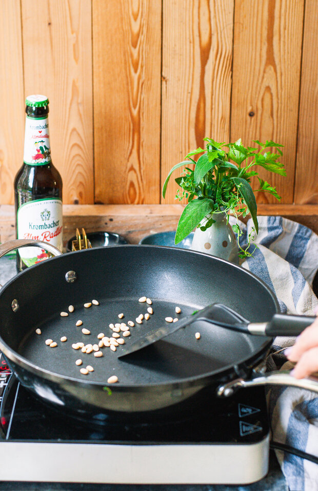 Die Pinienkerne ohne Öl in einer Pfanne anrösten.