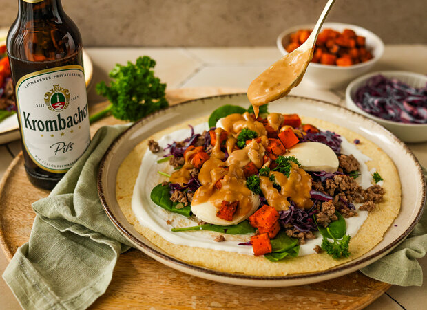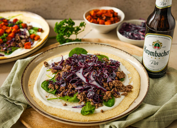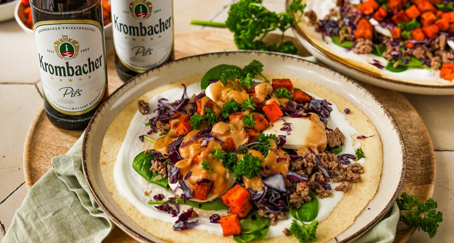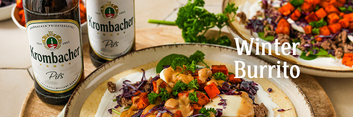 Diese winterlichen Burritos vereinen herzhafte Fülle mit einer überraschend sanften Erdnussnote und feiner Bier-Würze. Knackiger Rotkohl, zart geschmolzener Mozzarella und ofengebackene Süßkartoffeln treffen auf saftiges Hackfleisch und frischen Blattspinat - umhüllt von einem weich gewärmten Wrap.