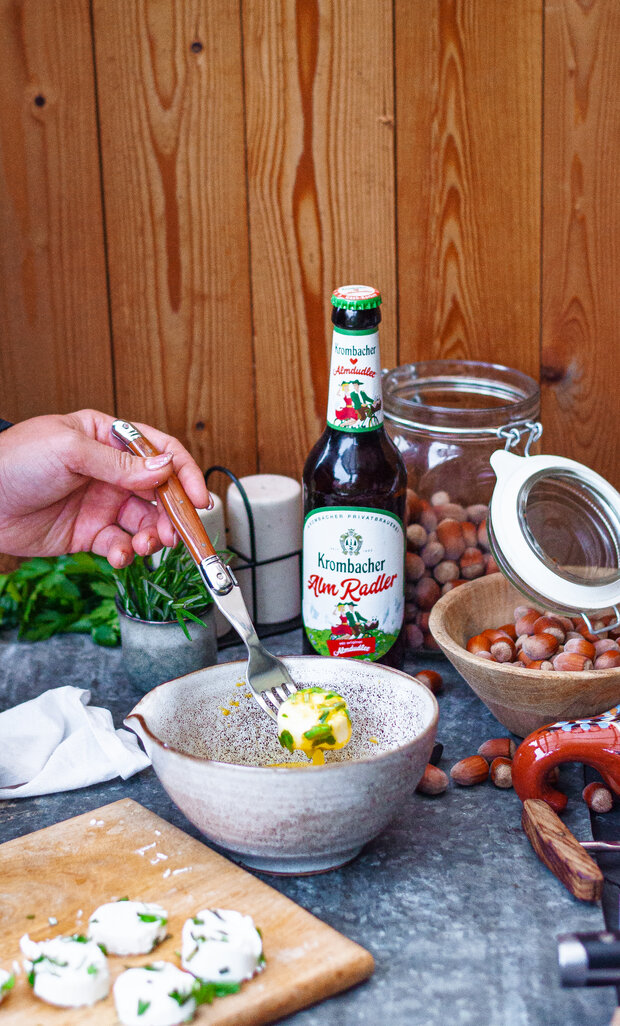 Den Ziegenfrischkäse in gleich große Portionen teilen und zu kleinen Talern formen. Die Taler leicht in den gehackten Kräutern wälzen, sodass sie rundherum