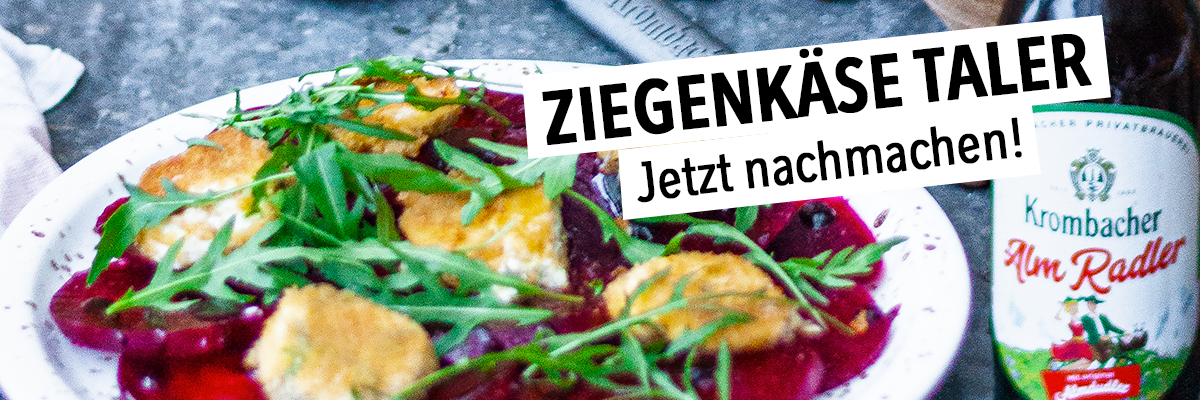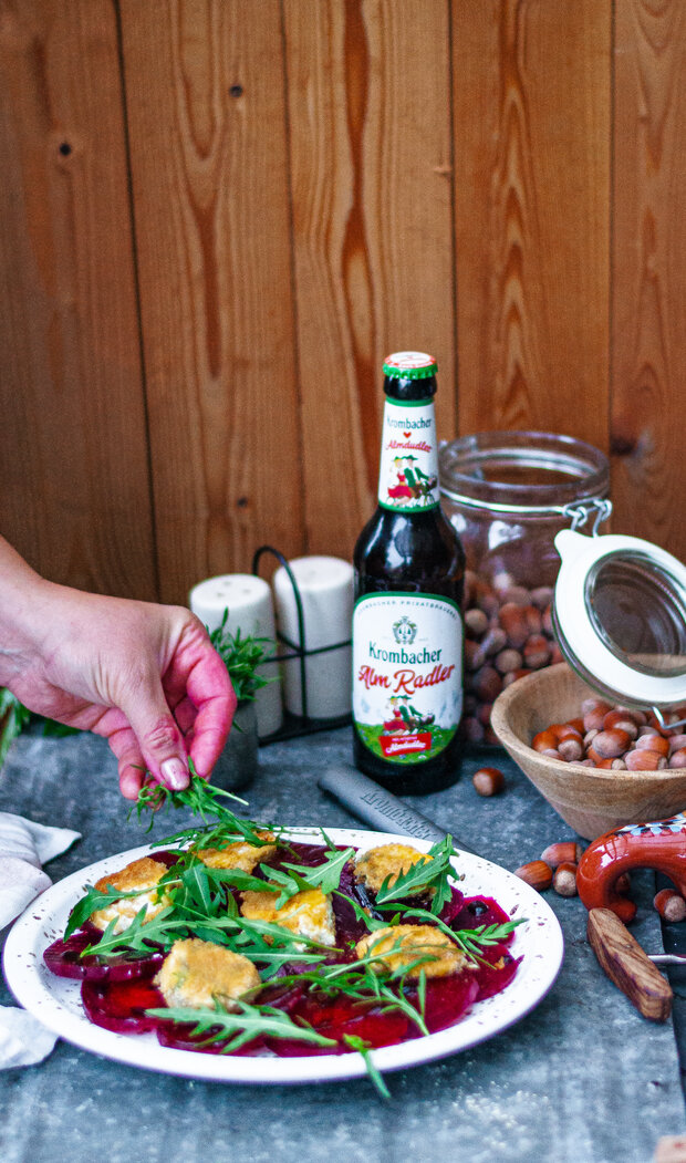 Das Rote-Bete-Carpaccio auf Tellern auslegen und die goldbraun gebratenen Ziegenkäse-Taler daraufsetzen. Mit frischem Rucola oder Feldsalat garnieren. Für ein zusätzliches Aroma kann das Gericht mit etwas Olivenöl oder Balsamico-Essig verfeinert werden. Serviert und genossen mit einem kühlen Krombacher AlmRadler – die perfekte Kombination.
